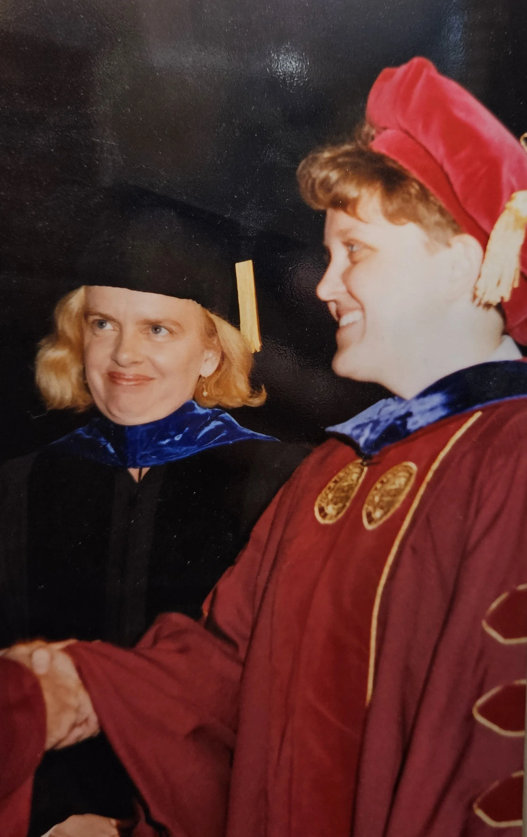 I’m on the right here—being congratulated by the president of Loyola University (Chicago). My dissertation advisor, Dr. Clarke, is on the left.